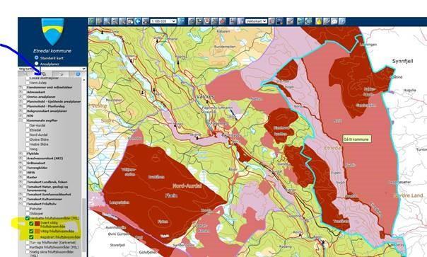 Huk av for «Verdsatte friluftslivområder» under tegnforklaring(blå pil):